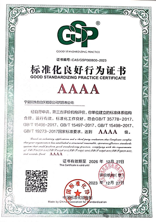 标准决定质量,高质量发展需要相应的高标准作为支撑。近年来,宁夏回族自治区固原市烟草专卖局(公司)以标准化赋能企业发展,高质量推进标准化体系建设,强化标准全生命周期管理,使“管理有章法、工作有流程、服务有标准”成为全员共识,推动企业管理水平全面提升。2023年,固原市局(公司)通过了中国标准化协会标准化良好行为企业AAAA级认证。