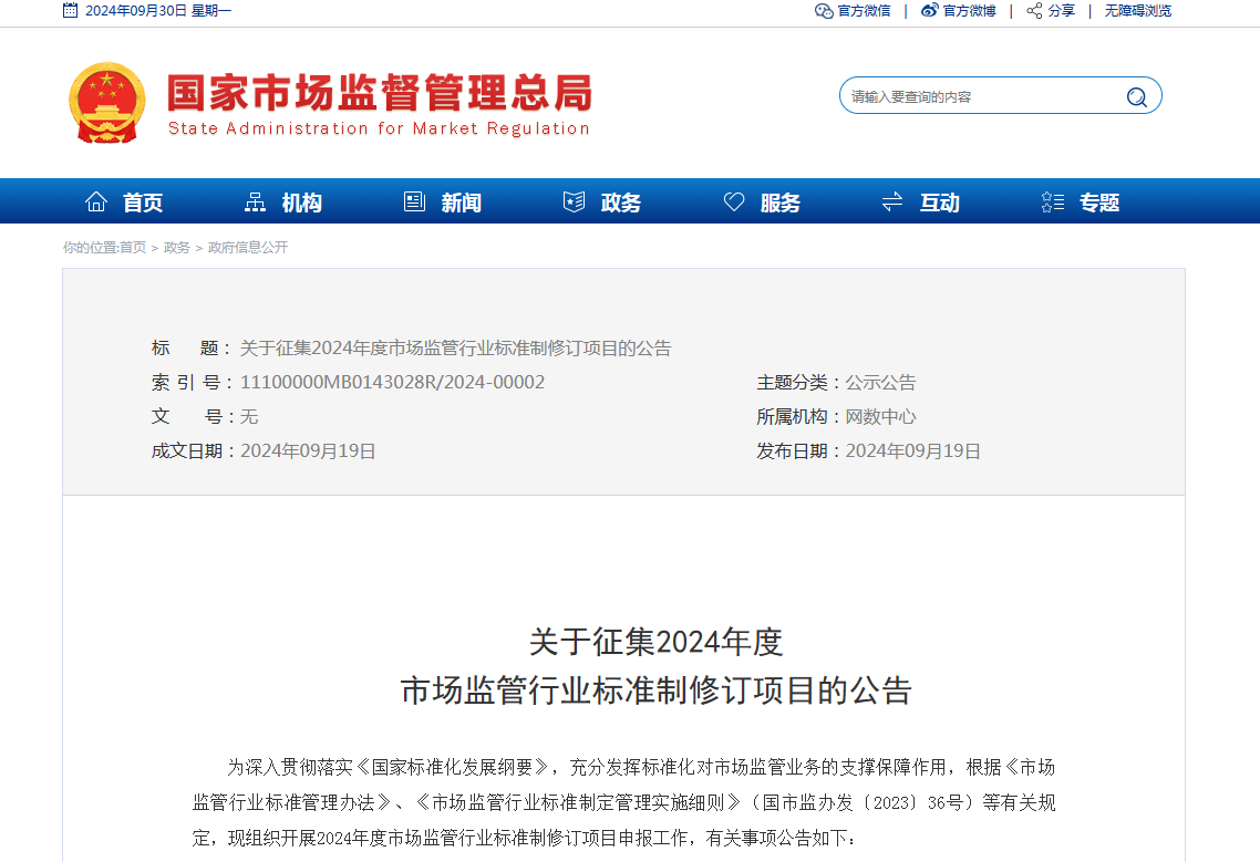 为深入贯彻落实《国家标准化发展纲要》,充分发挥标准化对市场监管业务的支撑保障作用,根据《市场监管行业标准管理办法》、《市场监管行业标准制定管理实施细则》(国市监办发〔2023〕36号)等有关规定,现组织开展2024年度市场监管行业标准制修订项目申报工作,有关事项公告如下:
