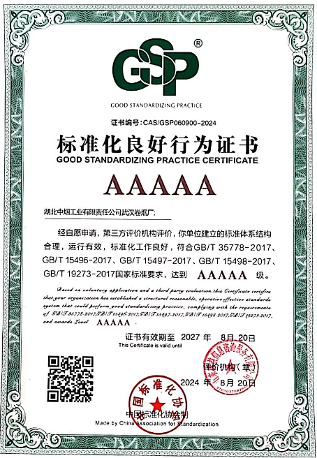 近日,湖北中烟工业有限责任公司武汉卷烟厂顺利通过中国标准化协会的资料评审和现场评价,成为湖北烟草工业首家获得标准化良好行为评价领域最高等级的企业。