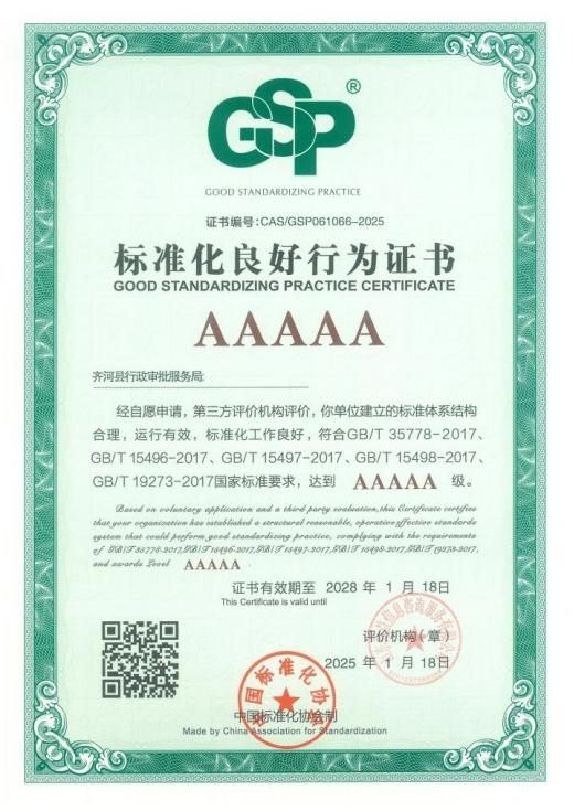 今年年初,齐河县行政审批服务局获得中国标准化协会颁发的“标准化良好行为AAAAA级证书”,成为行政审批领域全国首家县级市获证单位,齐河县审批服务业务流程标准化工作实现历史性新突破。