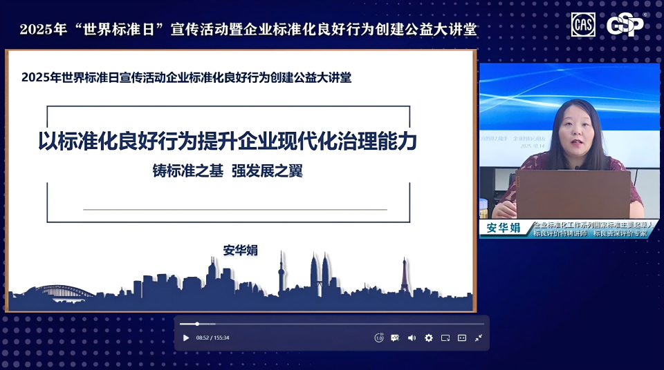 10 月 14 日,由中国标准化协会主办的 2025 年“世界标准日”宣传活动暨企业标准化良好行为创建公益大讲堂在线上顺利举办并取得圆满成功。此次活动获得广泛参与,累计达 3500 余人参与了本次直播活动,多家企业积极组织员工集中收看学习,展现出对标准化建设的高度重视。