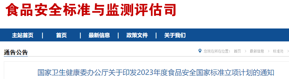 日前,《国家卫生健康委办公厅关于印发2023年度食品安全国家标准立项计划的通知》正式发布。具体内容如下: