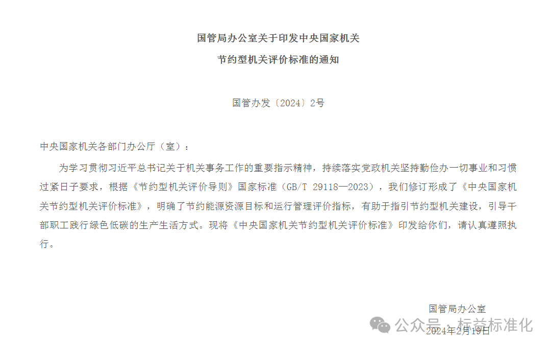 《通知》指出,国管局根据《节约型机关评价导则》国家标准(GB/T 29118—2023),修订形成了中央国家机关节约型机关评价标准,有助于指引中央国家机关建设节约型机关,引导干部职工践行绿色低碳的生产生活方式。
