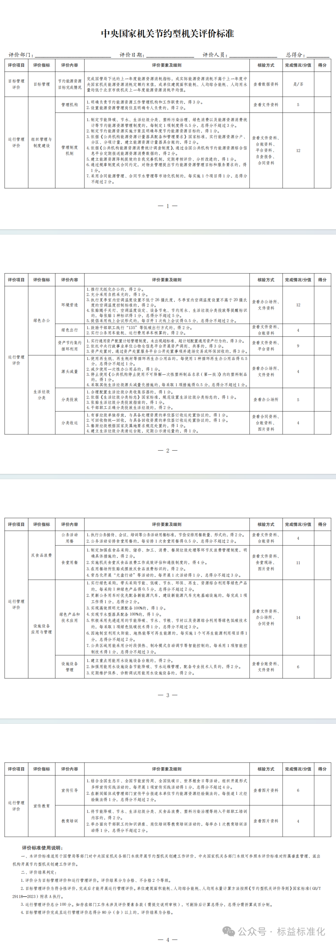 《通知》明确,中央国家机关节约型机关评价分为目标管理评价和运行管理评价。其中,目标管理评价为符合性评价,运行管理评价指标涉及组织管理与制度建设、绿色办公、生活垃圾分类、反食品浪费、设施设备应用与管理、宣传教育6个方面内容。目标管理评价完成且运行管理评价总得分80分以上的,评价合格。