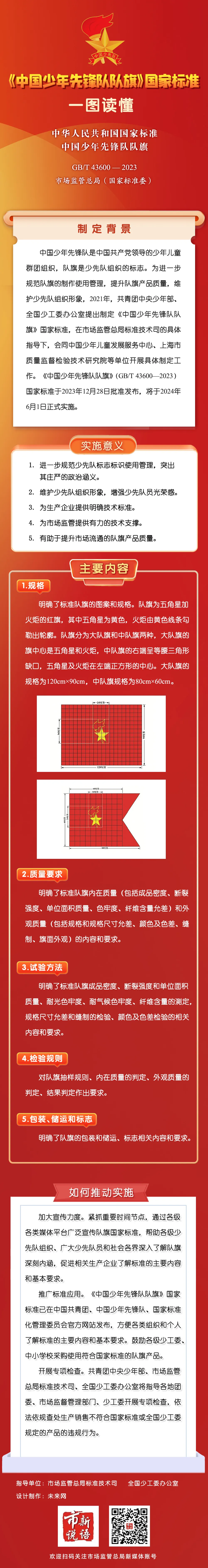 《中国少年先锋队队旗》(GB/T 43600—2023)国家标准将于2024年6月1日正式实施。该标准由市场监管总局(国家标准委)批准发布,共青团中央、全国少工委会同相关单位编制。