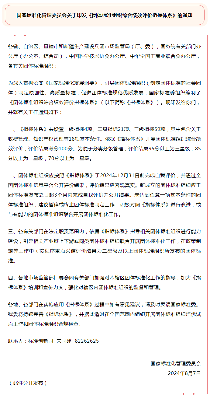 《团体标准组织综合绩效评价指标体系》印发