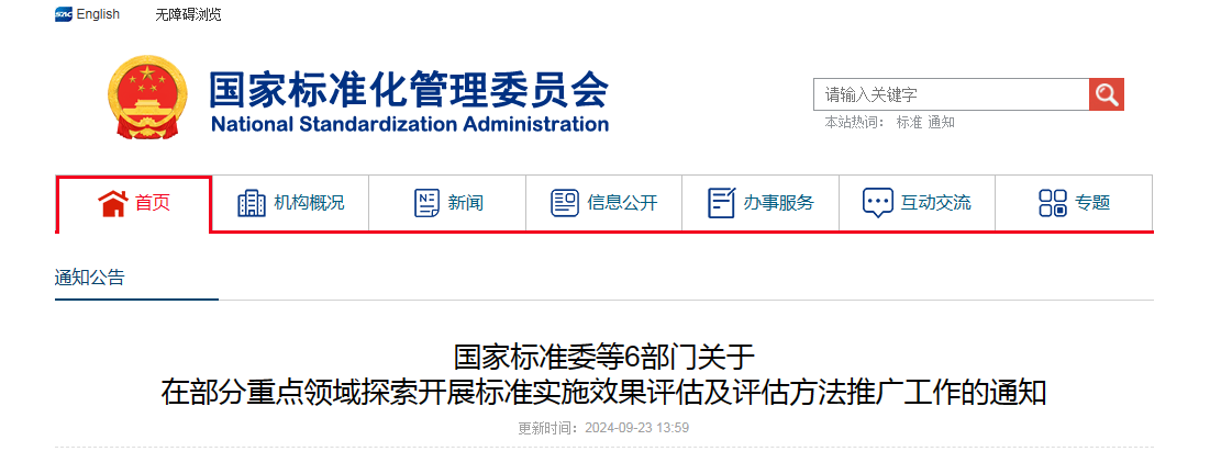 为贯彻落实《国家标准化发展纲要》和《贯彻实施〈国家标准化发展纲要〉行动计划(2024—2025年)》要求,健全标准实施效果评估机制,推进标准实施与监督,更好发挥标准引领作用,国家标准委会同交通运输部、水利部、文化和旅游部、中国人民银行、国家能源局等国务院有关行政主管部门(以下称有关部委)在部分重点领域开展标准实施效果评估及评估方法推广工作。现就有关事项通知如下:
