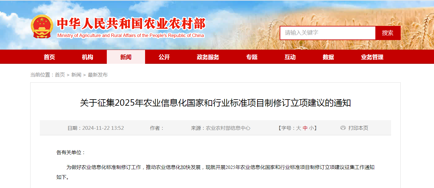 为做好农业信息化标准制修订工作,推动农业信息化加快发展,农业农村部信息中心现就开展2025年农业信息化国家和行业标准项目制修订立项建议征集工作通知如下。