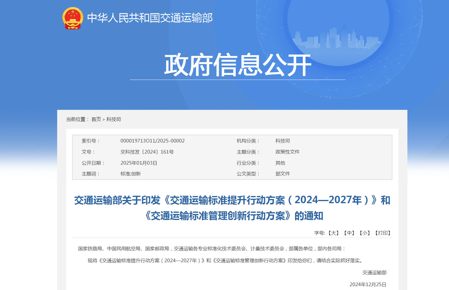 交通运输部关于印发《交通运输标准提升行动方案(2024—2027年)》和《交通运输标准管理创新行动方案》的通知