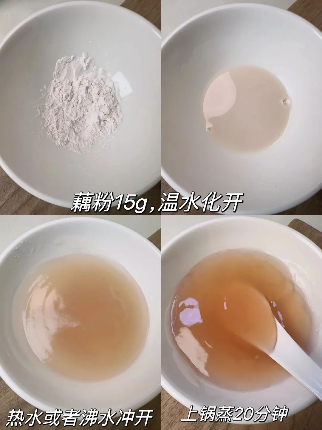 冲调藕粉时,先以冷水少许搅拌,直到藕粉完全化开,然后再倒入开水并快速搅拌。此时要确保开水温度达到100℃,如此藕粉才能变得透明粘稠,入口即化。