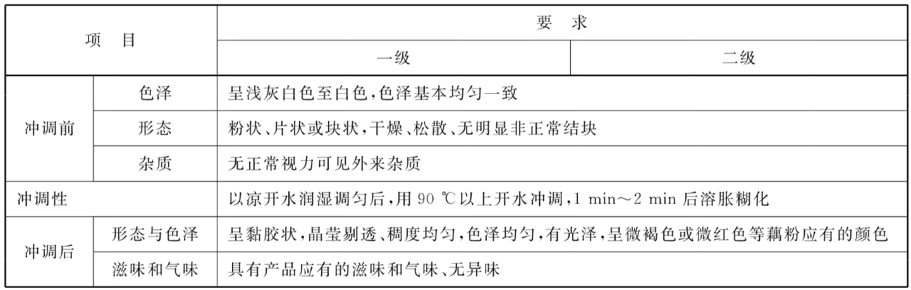 《藕粉质量通则》(GB/T 25733-2022)对纯藕粉冲调前后的感官要求做了规定