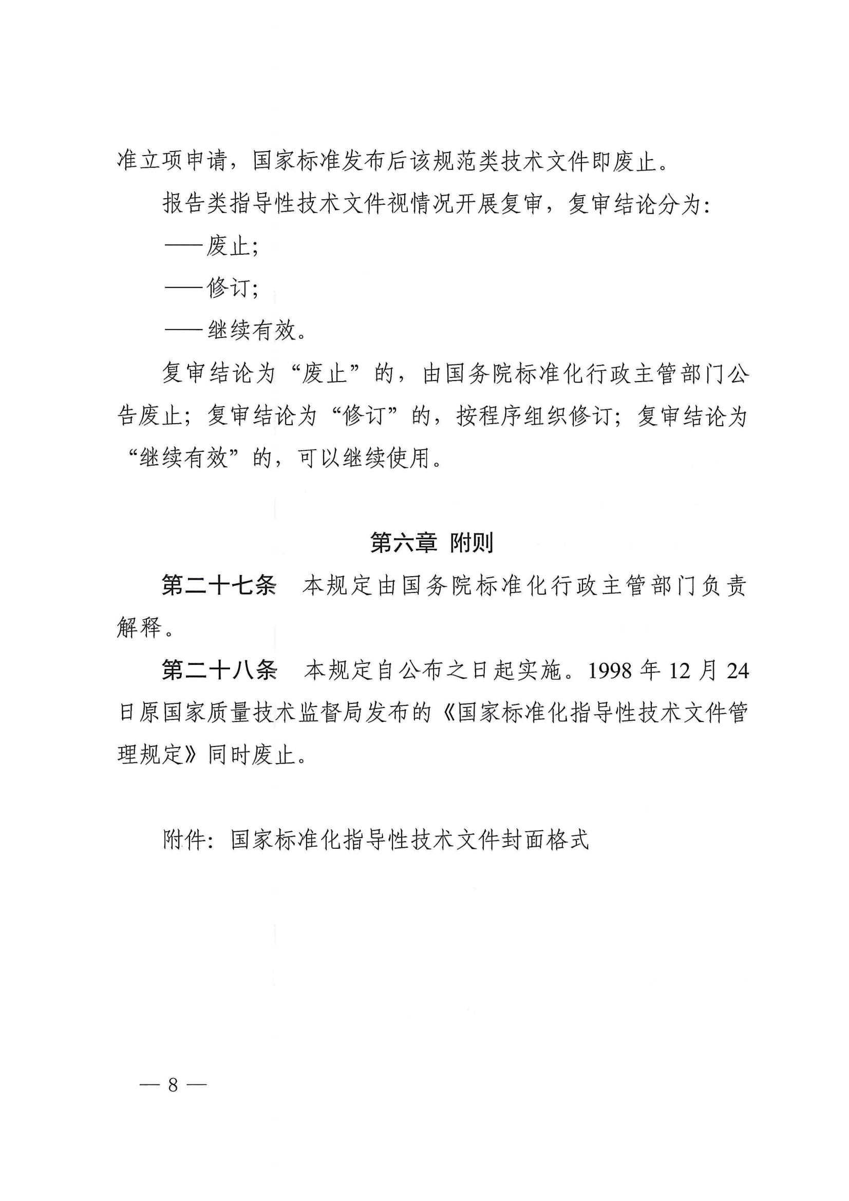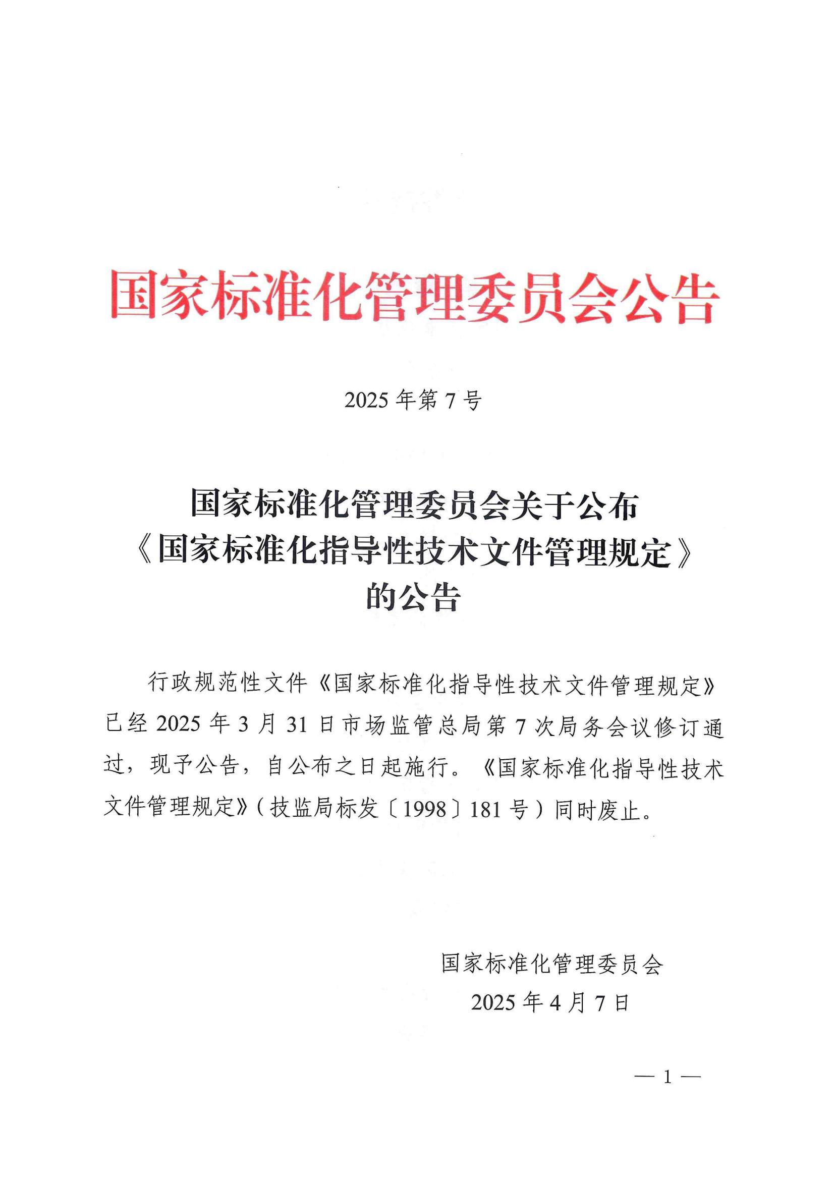 4月7日,国家标准化管理委员会修订公布《国家标准化指导性技术文件管理规定》(以下简称《管理规定》),即日起施行。国家标准化指导性技术文件是适应科技创新快速发展,在相关科研成果尚不具备制定国家标准条件时,支持引导创新技术推广试用、扩散成长的一种标准化技术文件,是国家标准的重要补充。